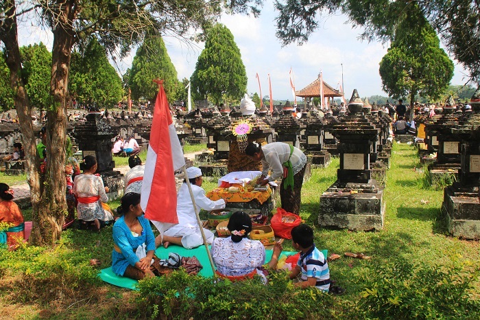 Relatives at one of the graves (stupa's) of a Balinese hero at the war monument in Marga during the commemoration of the Puputan Margarana on 20 November 2014 /author